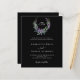 Schwarzer Hintergrund. Ein Blumenkranz aus Lavendel-Blume und einem Aquarell aus Eukalyptusgrün. Personalisieren Sie Ihre Monogramm-Initialen, Namen und Details und fügen Sie diese hinzu. Weißer Text. Zurück: Fügen Sie Ihre Hochzeitswebsite url zum QR-Code für Details und/oder UAWG.