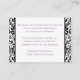 Diese moderne und trendige schwarz-weiße Damast Empfang Gehäusekarte verfügt über ein lila, PRINTED Leseband, das der unten gezeigten Hochzeitseinladung entspricht. Sie können es auch als Wunschkarte, als Anfahrtskarte oder als Unterkunftskarte, als Geschenkregister oder Hochzeitswebsite-Informationskarte oder für alle anderen Hochzeitsinformationen verwenden, die Ihre Gäste haben möchten. Wenn Sie weitere passende Artikel benötigen, schicken Sie bitte eine E-Mail an niteowlstudio@gmail.com.