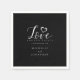 Christliche Hochzeitsnapkins mit inspirierender Zitat-Schrift zeigen ein einfaches modernes Schwarz-Weiß-Design. Es enthält die Namen des Paares und Bibel Verse 1 Korinther 13:8, "Liebe versage nie".