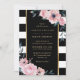 Elegante Aquarellfarben Rosa Blütenblütenhochzeit Einladungen mit rot-rosa Blume auf einem schwarz-weiß gestreiften Hintergrund. Matching-Elemente verfügbar. Diese Schwarz-Weiß-Hochzeitskarten können Sie ganz einfach mit Ihren Hochzeitsdetails personalisieren.