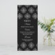 Dieses schicke Hochzeitsmenü mit elegantem schwarzem Hintergrund und einem weißen Schneeflocken-Damast-Design auf Oben und Unterseite. In der Mitte können Sie diese einfach mit Ihrem Menü anpassen.
