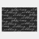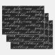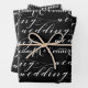 Ein modernes Muster der schönen weißen Kalligraphie des Wortes "Hochzeit" mit den Namen der Braut und Bräutigam in einem wiederholten Muster auf schwarz auf allen drei Blättern. Ein großartiges, individualisierbares, schwarz-weißes ästhetisches Hochzeitsverpackungspapier.