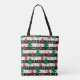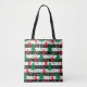 Schwarz-weiße Weihnachtsstreifen mit dekorativen Rot- und Grünen Bäumen mit fallender weißer und gelber, glänzender Schneeflocke Alles über Print Tote Tag Oberfläche Design.
