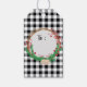 Ein Paket moderner Weihnachtsgeschenke Tags zur Krawatte Ihrer Geschenke . Die Vorderseite hat ein schwarz-weißes Buffalo-Karo-Muster mit einem rustikalen Kranz. Die Rückseite ist ein Imitat-Kalkboard mit einem Zweig von roten Beeren . Personalisieren Sie sie mit Ihrer eigenen Urlaubsnachricht und Ihrem eigenen Namen. © ArianeC Illustrations-Alle Rechte vorbehalten
