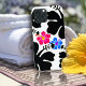Modernes Smartphone Gehäuse mit Blumenmotiven in Schwarz und Weiß. Unter den schwarzen Blume befinden sich zwei kleinere Blüten aus Hibiskus in leuchtend rosa und blau. Ein zeitgenössisches Design für viele Generationen von iPhone oder Galaxy.