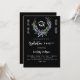 Schwarzer Hintergrund. Ein Blumenkranz aus Lavendel-Blume und einem Aquarell aus Eukalyptusgrün. Personalisieren und fügen Sie einen Namen und Details. Weißer Text.