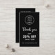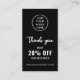 Eine vertikale minimalistisch angepasste Business-Logo schwarz-weiß QR-Code Rabattkarte für ein berufliches Unternehmen, um als Werbemittel zur Entwicklung der Kundenbindung zu verwenden. Ersetzen Sie das Bild durch ein quadratisches Foto Ihres Logos. Sie können den Schriftart, die Farbe des Schriftartes, die Größe des Schriftartes, den Abstand der Buchstaben, die Hintergrundfarbe, die Farbe der Dankeschön-Grafik ändern und den Text mithilfe des Entwurfstools neu positionieren. Sie können auch die Social Media Icons so ändern, dass sie für Ihr Unternehmen relevant sind. Das schlichte, moderne und elegante Design ist Ihr persönlicher Wunsch.
