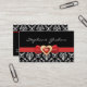 Schwarz-weißes Damast-Muster mit rotem Bogen- und Schmuckkarton mit schwarz-weißem Damast-Muster und einem roten Band mit Bogen und einem herzenförmigen Juwel, ebenfalls in Rot mit goldener Kontur und Strähne, das ein wenig Bling verleiht. Beachten Sie, dass der Bogen und der Herz-Diamant-Schmuck ist eine "gedruckte" Abbildung und nicht ein echter Kristall, so sind die Schichten. Ein elegantes und stilvolles feminines Visitenkartendesign. Trendy, modern und modern, perfekt für berufliche oder persönliche Zwecke.