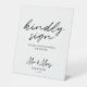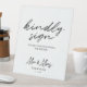 Ein einfaches, weißes und schwarzes Skript Text "freundlich unterschreiben" Hochzeitstisch-Zeichen, um Ihren Gast zu ermutigen, Ihr Hochzeitsgast-Buch zu unterschreiben.