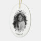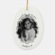Feiern Sie mit unserem eleganten ovalen Foto Weihnachtsschmuck aus der Keramik. Dieses zeitlose Stück weist oben eine einfache Bogen-Abbildung auf, die eine Touch klassischen Charmes hinzufügt. Das Ornament ist mit einem skurrilen und niedlichen Flügelrahmen entworfen, in dem Sie ein hoch geschätztes Foto einfügen können, das es zu einem perfekten Sake für Ihren Baum macht. Dieses Ornament ist nicht nur eine Dekoration, es ist eine Erinnerung, die in einem schönen, anpassbaren Design eingefangen ist. Ideal, um Ihrer eigenen Urlaubssammlung eine persönliche Touch zu geben oder hinzuzufügen. In einer Schwarz-Weiß-Palette angezeigt, aber ALLE FARBEN SIND VERTIEFBAR. Sie können verschiedene Farben für Hintergrund, Rahmen und Bogen sowie Text auswählen. (Vergewissern Sie sich, dass Sie beide Seiten des Ornaments bearbeiten.) Auf das Foto wurde ein Schwarz-Weiß-Filter aufgetragen, der mit dem Bearbeiten-Tool entfernt werden kann, wenn Sie Ihr Foto lieber farbig behalten haben. © Kimbellished, LLC