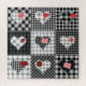 Nahtloses Hintergrundmuster. Wird endlos kacheln. Schwarz-Weiß Patchwork mit Herz und roten Patches. Die Herzen sind mit roten Fliesen verziert, die Dekoration ist mit Lieben gefüllt. Äußern Sie Ihre Zuneigung kreativ. Schwarz-Weiß Patchwork Herzmuster: Liebe, Muster, Hintergrund, Flickwerk, Herz, nahtlos, Illustration, Dekoration, Quilt, Quadrat, Textur, Faden, Naht, Kurve, Quilting, Darning, Wiederholung, Wiederholung, Valentin, Kontinuität