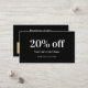 Schwarzer Hintergrund, weißer Text. Auf der Vorderseite: Fügen Sie Ihren Rabatt hinzu. Zurück: Personalisieren Sie Ihren Firmennamen, Ihre Telefonnummer, Ihre E-Mail, Ihre Website-Adresse, Ihr Logo, Ihren qr-Code auf Ihrer Website oder Ihrem Social-Media-Konto.
