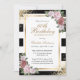 Elegante Schwarz-Gold-Geburtstags-Einladung mit rot-rosa Blume und Grün, die die Details der Geburtstagsparty auf einem schwarz-weißen Hintergrund mit goldenen Konfetti umrahmen. Blüte Blumengeburt Einladung. Blush und Gold Einladung zum Geburtstag. Rosa und goldene Geburtstagseinladung. Rosa Geburtstagseinladung. Einladung zum Geburtstag in Schwarz und Gold. Schwarz-Weiß-Einladung zum Geburtstag. Personalisieren Sie diese Vorlage ganz einfach an jede Geburtstagsparty.