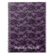 Schwarze Blumenspitze auf lila Notizbuch. Erinnern Sie sich an die Strumpf des Schwarzen Fischnetzes. Ein tolles Geschenk für die Brautmädchen am Junggeselinnen-Abschied! Schwarze Spitzen, Spitzen, Blüten, Strümpfe, Fischernetze, Junggeselinnen-Abschied Geschenke, Bridesmädchen, Geschenke für Brautmädchen, lila