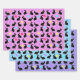 Dieses Set der Umhüllung Papierblätter haben ein wiederholtes Bild schwarzen Silhouette Hasen mit einem rosa Augen in einer Sitzposition mit einem Ring von bunten Blume auf ihren Hals. Mehr Blütenblätter werden zwischen den Kaninchen auf pastellfarbenen Hintergründen in Rosa, lila und Blau verteilt.