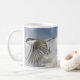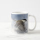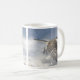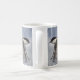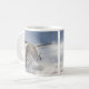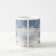Fotografie eines schwarz gekappten Chickadees in Flug gegen den wolkigen Himmel. Design auf beiden Seiten der Tasse.