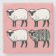 Selbst ein schwarzes Schaf, das Symbol der Nichteinhaltung, sieht ganz normal aus, wenn man es mit einem schwarzen Damast-Schaf vergleicht! Lassen Sie sich auf elegante Weise von diesem Untersetzer mit normalen weißen Schafen und einem ausgefallenen schwarzen Damast Schaf auf einem rosa Diamant gemusterten Hintergrund verzaubern.