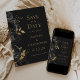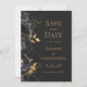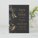 Diese elegante moderne Hochzeit speichern die Dattelkarte mit einem Rand von schwarzen Blume und goldenen Imitaten Folie Blätter. Passen Sie den goldfarbenen Text auf einem schwarzen Hintergrund mit dunklem Schiefer an. Die Rückseite der Karte ist schwarz aus massivem Schiefer.
