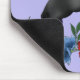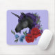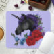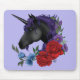 Ein schwarzes Einhornprofil mit roten, lila und blauen Blumen in einem lila hellen Hintergrund