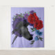 Ein Schwarzes Einhorn mit roten, lila und blauen Blume in einer lila Umgebung