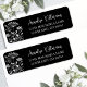 Rücksendeetikett mit Wildblumendesign. Dieses minimalistische und elegante Etikett ist perfekt für Brautduschen, Babypartys oder jeden, der einen einfachen, zeitlosen Stil liebt. Das Design zeigt einen schwarzen Hintergrund mit einer zarten weißen Umriss-Illustration einer Wildblume auf der linken Seite für eine weiche, moderne Note.