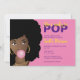 Dieses Design ist mit einem Bubblegum-Thema. Afrikanisch-amerikanische Frau mit schwarzem Afro, rosa Bublegum auf rosa Hintergrund. Der Text ist lila und gelb und kann angepasst werden. Ideal für eine Babydusche.