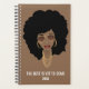 Das Beste ist noch für das neue Jahr... Plan dementsprechend. Afrikanische amerikanische Schönheit mit natürlichem Haar afro, goldenes Accessoire und Sonnenbrille auf braunem Boden. Text in Goldfarbe.