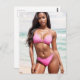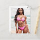 Diese Postkarte zeigt ein fotografisches Bild eines schönen Badebekleidungsmodells aus der afrikanischen Diaspora. Sie hat lange Haare und trägt einen rosa Bikini, während sie am Strand mit dem Ozean hinter sich Pose. Ihr Ausdruck ist ein bisschen sauer. Gutes sommerliches ästhetisches Bild für immer!
