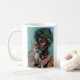 Farbenfrohe Malerei von einer schwarzen Frau, die Kleidung und Schmuck mit afrikanischem Muster trägt. Holt ihre schöne Katze