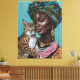 Farbenfrohe Malerei von einer schwarzen Frau, die Kleidung und Schmuck mit afrikanischem Muster trägt. Holt ihre schöne Katze