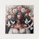 Weibliche Blumenkunst einer wunderschönen Schwarzen, die von Blume geschmückt und von Tauben umgeben ist. Ihre Augen sind in einem ruhigen Ausdruck geschlossen, und sie trägt ein Bauernkleid. Die melaninreiche dunkelbraune Schönheit könnte afrikanisch-amerikanisch, afro-latina, karibisch, afro-britisch, etc. sein. Eine hyperfeminine Blütenhaut und Engelcore ästhetische Malerei einer wunderschönen melanierten Frau.