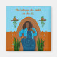Dieses Design zeichnet sich durch eine kurvige afrikanisch-amerikanische Schönheit aus, mit einer blauen Jacke und einem Kleid auf einer terra-cotta-farbenen Wand mit Pflanze und blauem Hintergrund. Das Zitat: "Sie glaubte, sie könnte es, also tat sie es".