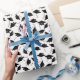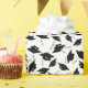 Schwarze Graduierungskappen, die in die Luft geworfen werden, machen ein schönes Design auf diesem Abschluss, das Papier für ein Schwarz-Weiß-High School oder Uni-Abschluss-Party verpackt. Schwarze Graduierungskappen auf weißem Hintergrund.