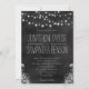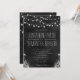 Zeichenkette der Lichter Chalkboard © Sonnenanbeter Mars Designs. Stilvoll, modern, elegant, elegant, elegant, elegant, trendig, chic anpassbar formale oder niedliche lässige 5" x 7" Hochzeitseinladungen mit einem schönen schwarzen Chalkboard-Design mit Glühbirnen aus Seil oder Saitenlampen über mit einem floralen tropischen Design unten.