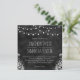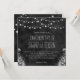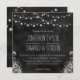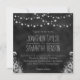 Zeichenkette der Lichter Chalkboard © Sonnenanbeter Mars Designs. Stilvoll, modern, elegant, elegant, elegant, elegant, trendig, chic anpassbar formale oder niedliche lässige 5.25" x 5.25" Hochzeitseinladungen mit einem schönen schwarzen Chalkboard-Design mit Glühbirnen aus Seil oder Saitenleuchten, die oben mit einem floralen tropischen Design unten hängen.
