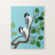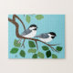 Schwarze Kappenschabe auf grünem Baumzweig mit blauem Himmelshintergrund