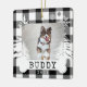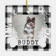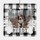 Rustikaler Bauernhof Frische Weihnachtsbäume Haustiere Foto Sake-Ornament. Das Ornament kann mit dem Namen des Tieres, dem Jahr und dem Foto abgestimmt werden. Schwarzes Schachbrett karierter Hintergrund mit rustikalen Kiefern und Schneeflocken. Der Name des Tieres wird auf einem weißen Hundeband angezeigt. Kunst von Moodthology Papery.