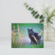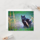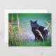 Eine schwarze Katze mit sehr intensiven Augen starrt eingehend in Rahmen, umgeben von surrealen Farben zwischen Gras und Unkraut.