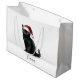 Schwarze Katze auf festlichem Weihnachtsmannmütze Große Geschenktüte