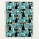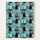 Farbenfrohe abstrakte Muster aus der Mitte des Jahrhunderts mit schwarzer Katze, schwarzen Sternen und farbenfrohen (blauen, weißen, rosa) Würfeln auf türkisfarbenem Hintergrund für jeden Katzenliebhaber, Katzenmama und Katzenpapa.