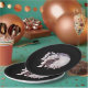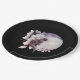Papier Teller mit einem Aquarellbild einer schwarzen Katze und einem lila und rosa Blumenstrauß. Stehend vor einem großen Vollmond. Stilvoll und magisch.