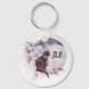 Eine Schlüsselkette mit einem Aquarellbild einer schwarzen Katze und einem lila und rosa Blumenstrauß. Stehend vor einem großen Vollmond. Stilvoll und magisch.