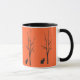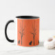 Diese Halloween-Tasse kennzeichnet ein wiederholendes Muster der schwarzen Katzen unter den bloßen schwarzen Bäumen, die heraus Ihnen gegen einen glänzenden orange Hintergrund recht betrachten.