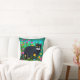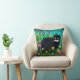 Kissen in einem Bild einer schwarzen Katze mit auffälligen gelben Augen inmitten lebendiger, farbenfroher Blume in Rosa, Gelb, Rot und Blau. Das üppige grüne Grün und der helle, gesättigte Hintergrund verleihen der Szene ein lebendiges, skurriles Ambiente.
