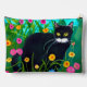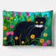 Pouch in einem Bild einer schwarzen Katze mit auffälligen gelben Augen, die inmitten lebendiger, farbenfroher Blume in Rosa, Gelb, Rot und Blau sitzt. Das üppige grüne Grün und der helle, gesättigte Hintergrund verleihen der Szene ein lebendiges, skurriles Ambiente.