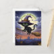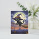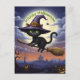 Diese skurrile schwarze Katze mit leuchtenden Augen ist wie eine Hexe verkleidet und wünscht jedem ein glückliches Halloween, während sie auf einem Besen, Halloween, durch die Nacht fliegt. Perfekte Karte für alle.