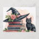 Diese Postkarte zeigt eine schwarze Katze neben einem Bücherstapel mit einem Hexenhut darauf. Diese feminine Kunst ist perfekt für Halloween oder für jeden, der schwarze Katzen, Akademiker und Hexenthemen liebt. Die rosa Rosen fügen eine weiche, zarte Note für Pink-o-ween oder Bubblegum-Goth-Ästhetik hinzu.