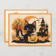Eine niedliche Halloween-Abbildung, in der eine schwarze Katze fröhlich einen Kürbiseimer mit Leckereien gefüllten Süßeimer hält. Ideal für diejenigen, die Liebe spielerisch und süße Halloween-Gemälde.