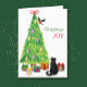 An der Vorderseite dieser Weihnachtskarte sitzt eine seltsame schwarze Katze neben einem Holiday Baum und sieht zu, wie eine Stierfinke darauf landet. Britisch verpackte Geschenkpakete sind verstreut. Der rote und grüne Text sagt "Christmas JOY". Inside ist stilisierter Text, der MERRY CHRISTMAS sagt, und ein Textfeld für Sie anpassen.