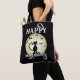 Der weiße Text auf diesem Trick oder Treat-Tasche sagt "HAPPY HALLOWEEN", der Text ist über und unter einem Vollmond. Gegen den Mond sitzt eine schwarze Katze mit orangefarbenen Augen und mehreren fliegenden Fledermausaugen. Beide Seiten haben das gleiche Bild.